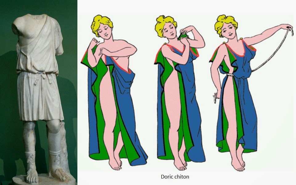 The Doric chiton is a single rectangle of woolen or linen fabric. It can be worn plain or with an overfold called an apotygma which is more common to women. It can be draped and fastened at the