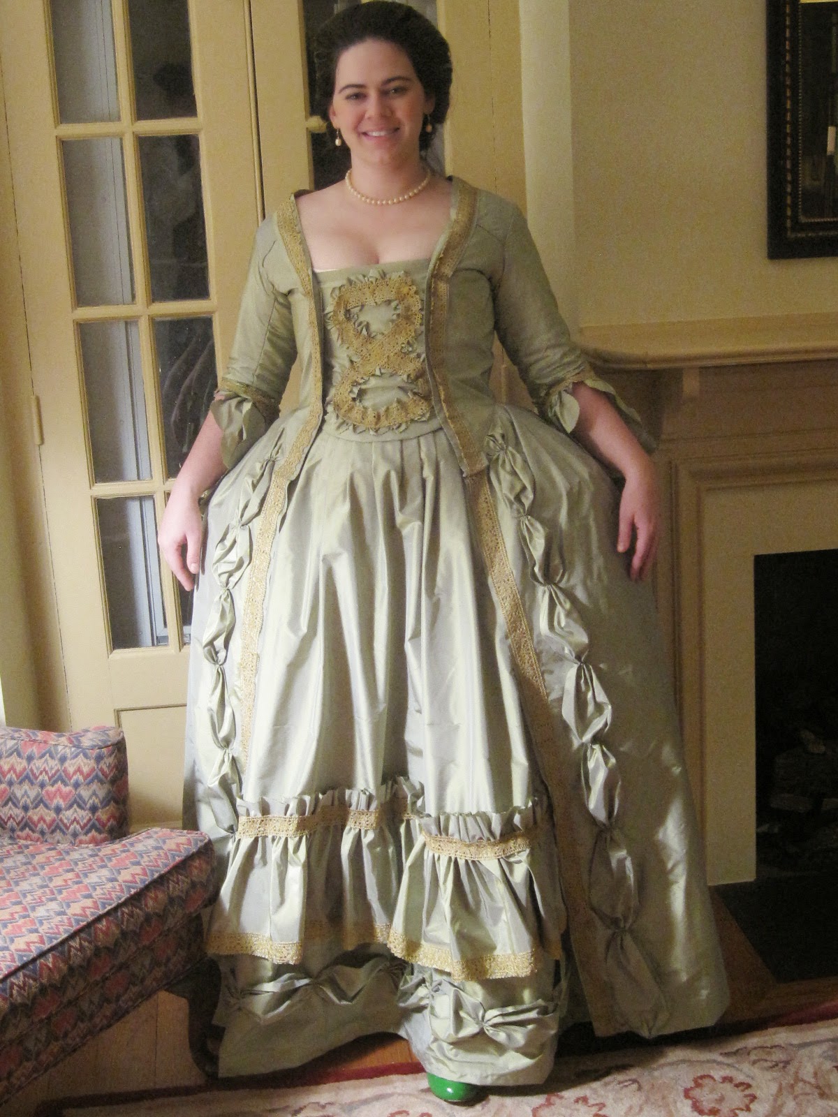 The sack, or sacque, gown evolved from a very informal dress of the late seventeenth century into a formal dress by the mid-eighteenth century. The sack gown was first a loose, tent-like robe worn in the home or by pregnant women. The volume of the gown came from gathers near the shoulders and along the back. The front of the gown skirt was worn either open in the front to reveal a petticoat or stitched closed from the waist down to the hemline. As the century continued, these gowns became more formal, featuring fitted bodices, long full skirts, and a long box-pleated piece of fabric hanging from neck to ankles along their backs. These dresses were so often depicted in the paintings of French painter Antoine Watteau (1684–1721), the man who created the Rococo painting style that emphasized romantic love, that the pleats in back took his name: Watteau pleats. As the dresses became more fitted through the bodice, the gown came to be known as the robe à l'anglaise. The robe à l'anglaise was especially popular in England (anglaise means English in French) and featured a many-pieced bodice with a low neckline. The sack gown went out of style by the end of the century when Greek inspired dresses, such as the robe en chemise, became popular.
